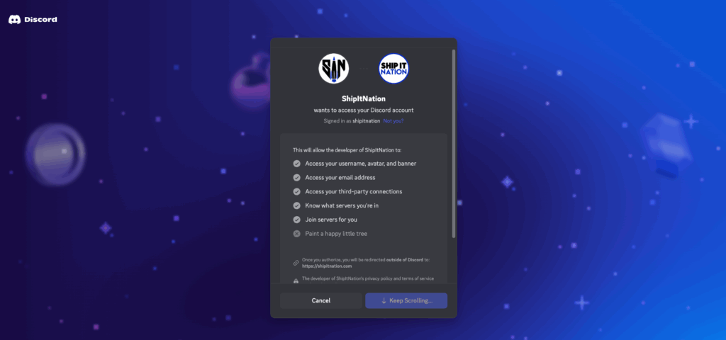 Common issues include being logged into the wrong Discord account, not completing the Authorize step, or an expired Ship It Nation membership.